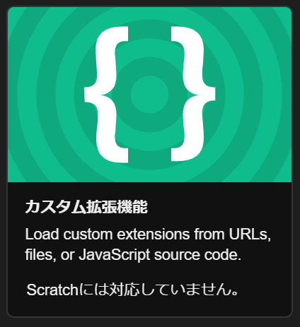 このような拡張機能はTurboWarpの拡張機能を選択する画面の一番下にある、「カスタム拡張機能」から読み込むことができます。一度クリックすると、URLを入力する画面になるのでURLを入力してください。私の拡張機能なら「https://52tellur.github.io/extensions/Tellur.js」を入力します。